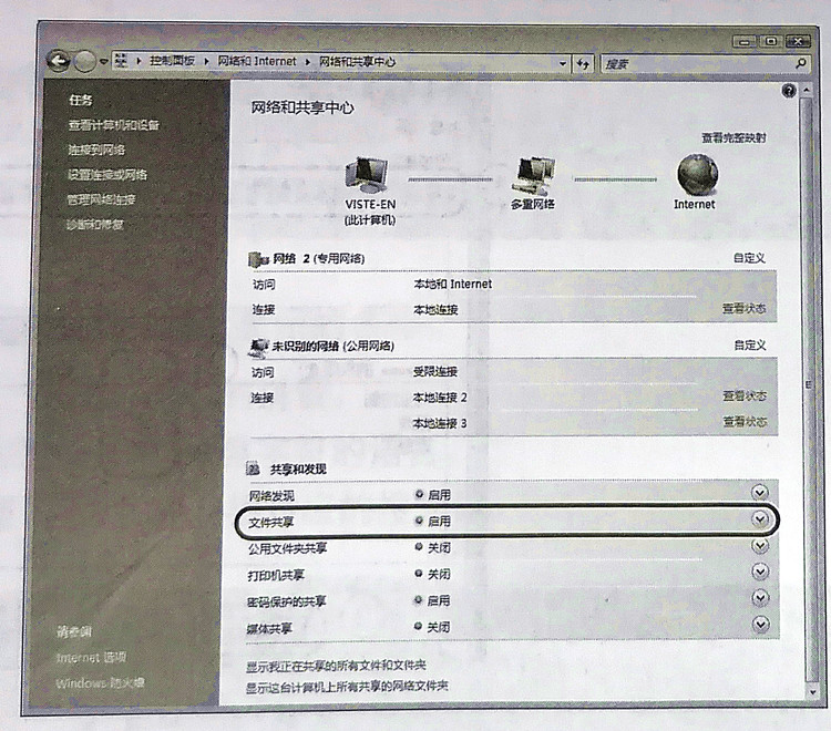 Internet] - [网络和共享中心] 一[更改高级共享设置],然后选中[启用文件和打印机共享]